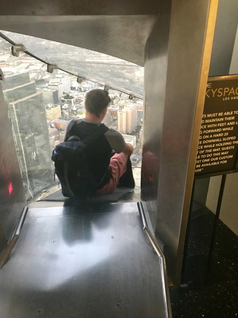 Go down the Sky Slide in downtown L.A. It’s an outdoor glass slide 1,000 feet above L.A. that’s attached to the exterior of the tallest building in L.A. And I thought the Dearly Departed Tour was scary. I may have suffered a small heart attack on this slide. “It’s so much fun.” my son declared …I describe it as yet another one of those terrifying yet exhilarating activities that we have come across during our travels together. A ride on the slide can be purchased along with access to the observation decks . Tickets were $ 32.00 (including the slide) and views from the observation deck at sunset were unbeatable.