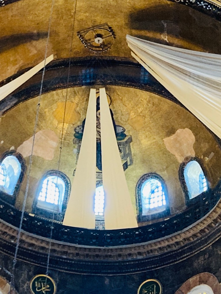Visit the Hagia Sophia– This is such an amazing structure with a fascinating history. It was originally built as a Christian Basilica almost 1,500 years ago. Built for the Greek Orthodox Christian Church, the columns were imported from an ancient temple in Ephesus and also from Egypt. Emperors were actually crowned here. When the Ottoman’s conquered the city in the 1400s, they turned the Hagia Sophia into a mosque and covered the religious icons and mosaics. In 1935 it was declared a museum by the government and some of the icons were uncovered until just recently, when it was converted back into a mosque under the order of the current president.It’s like the Hagia Sophia suffers from an identity crisis! Non-Muslims are permitted to visit for free after removing shoes and covering shoulders (and heads for ladies). There are still a very few original Christian frescoes that can be seen hidden behind curtains. This was such an interesting place to stand inside of.